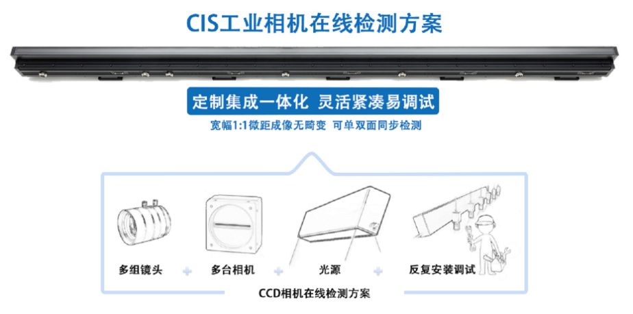 而CIS因工作距離短,對(duì)穿過孔洞的透射光感度高,更適合檢測孔洞及各類瑕疵,且圖像1:1不變形。且CIS僅需在產(chǎn)線上或檢測設(shè)備上安裝,無需拼接使用;通過不同長度的外觀設(shè)計(jì),單臺(tái)產(chǎn)品可滿足不同檢測物的掃描需求;能夠提升產(chǎn)線檢測效率,大幅節(jié)約人力成本。
