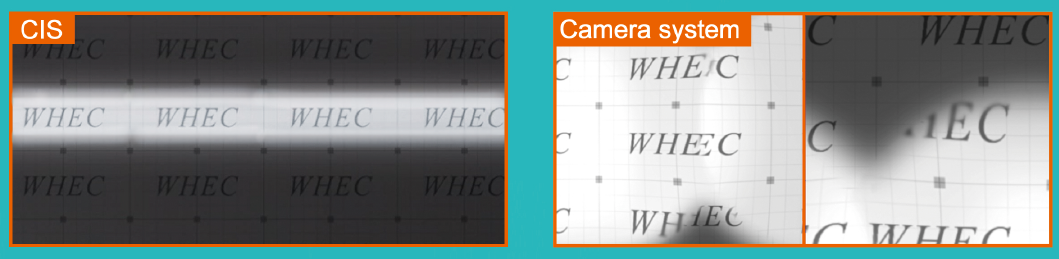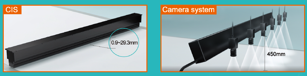 常見的印刷視覺檢測系統由工業相機、鏡頭和光源等主要部分組成。基于工業相機的檢測系統應用廣泛,但也有一些天生的缺陷,比如工作距離遠,相機需要距離印刷物0.5m~1m左右,在一些應用場景中安裝困難;鏡頭邊緣的圖像會有變形,導致印刷物邊緣檢測精度降低等。于是接觸式圖像傳感器(Contact Image Sensor簡稱CIS)作為一種高度集成的成像方案檢測系統制造商的青睞。CIS在一體化的緊湊外形中容納了感光IC、透鏡和光源,在實現相機系統功能的同時又具備工作距離短、圖像沒有變形等優勢。
