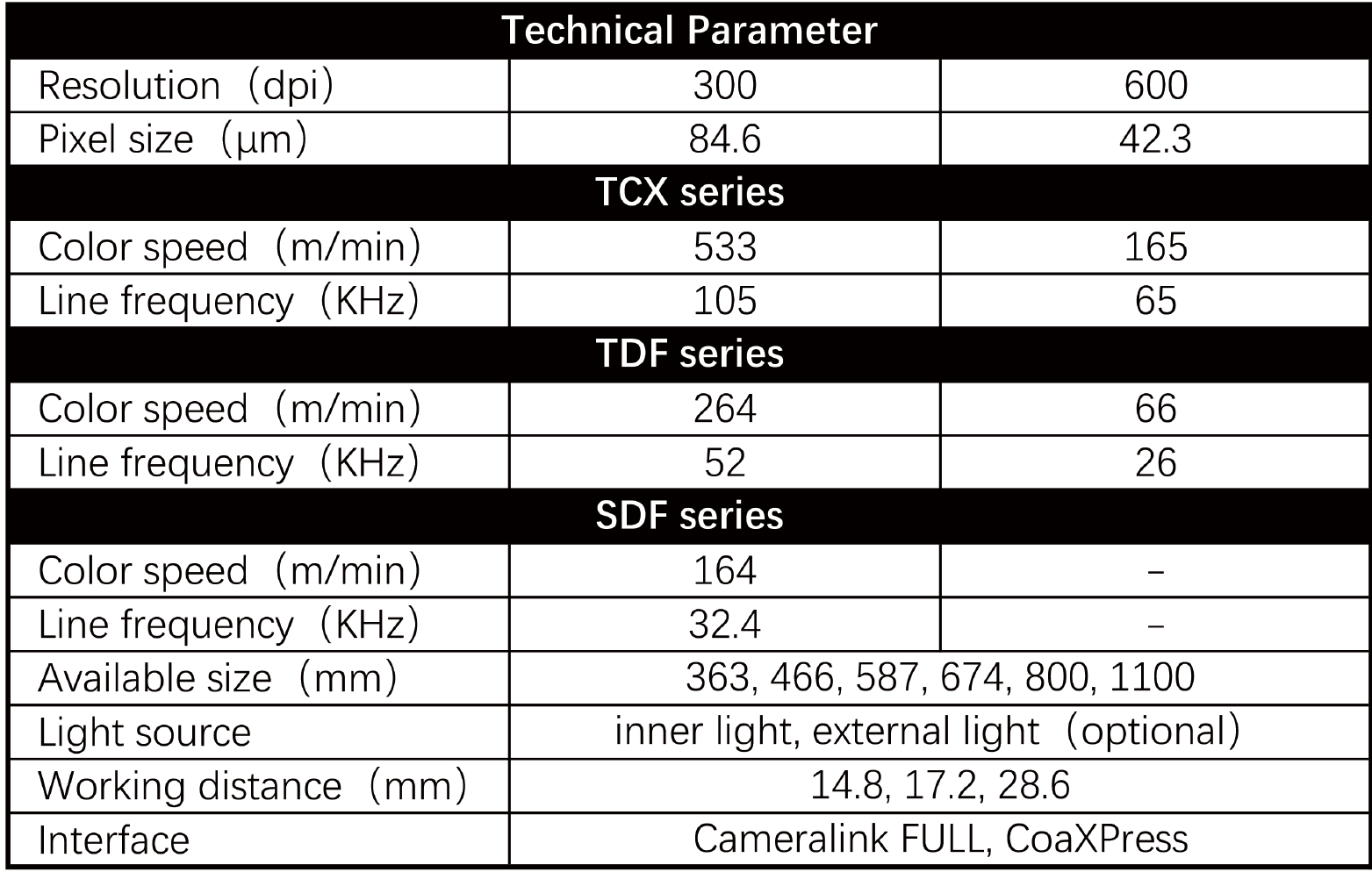 WHEC與多家國際知名印刷檢測系統廠商深入溝通后,了解到他們非常認可CIS體積小、圖像無變形和安裝簡單的優勢,同時也提出了幅寬、速度和成本方面的問題。充分理解客戶的痛點后,在速度方面,WHEC推出了TCX、TDF、SDF三個系列分別滿足高速(max 480m/min),中速(max 260m/min)和低速(max 150m/min)市場需求,允許客戶根據預算有更多的選擇;在幅寬方面,WHEC調查了常見標簽印刷機的幅寬,推出了363, 466, 587, 674mm等幅寬;在分辨率方面,WHEC了解到傳統印刷機分辨率較低但速度快,新興的數碼印刷機分辨率高但速度較慢,所以提供可切換的300dpi和600dpi兩個分辨率選擇,幫助客戶實現同一個產品覆蓋更多的用途。